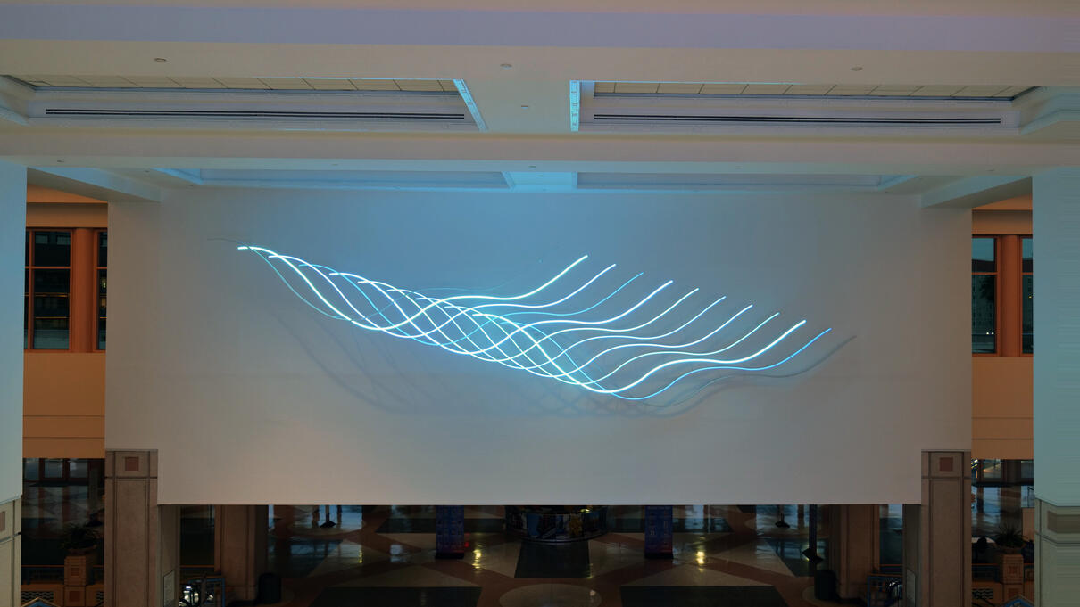Recurrence, by Luftwerk, was recently installed at the Tampa Convention Center. This is the first of three installations coming to the Tampa Convention Center. Recurrence brings the outside environment into the Convention Center, and much like the coastal city, represents the meeting point of the natural world and our built environment. Using data from National Oceanic and Atmospheric Administration (NOAA), this dimensional wall sculpture interprets the Hillsborough Bay and Davis Island tidal pattern. The shape of the LED lines and changing colors visualize this diurnal tidal cycle where tides rise and fall along the lunar day.