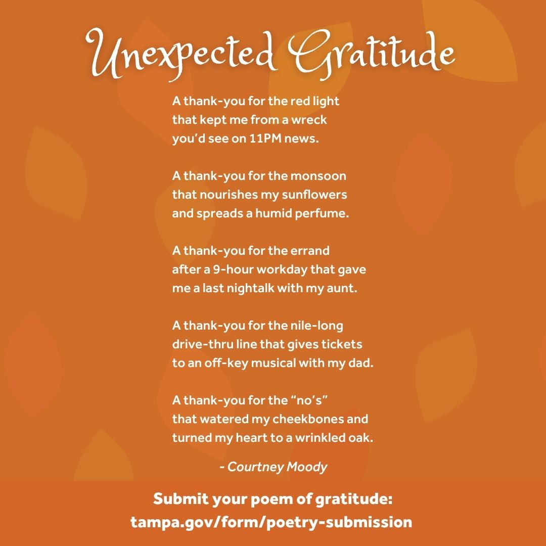 For National Poetry Month, we made a call to the city—send us your Tampa poems! And did we get some great submissions! Whether you call it the Big Guava, T-Town or Champa, you showed some love for this place we call home. Your poems celebrated pirates, Bucs and Rays. The Riverwalk and downtown. Old brick streets, the longest sidewalk and the bay. Poems arrived as love letters and keen observations, as history lessons and architectural celebrations. Some of you paid homage to our past. Some of you praised our city’s natural beauty. With over 60 submissions of poems and songs from adults and school children, we decided we couldn’t declare just one winner. After a lot of deliberation, we have selected our top poems.