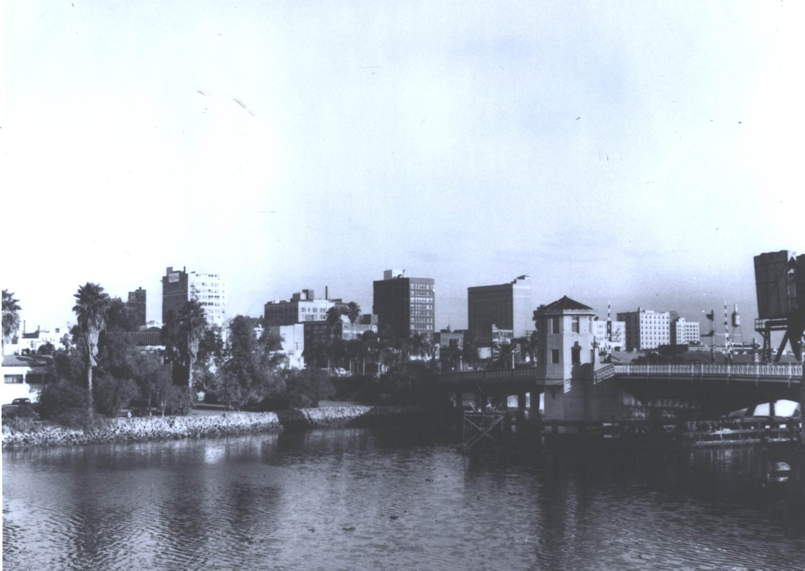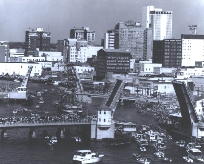 The Platt Street and Brorein Street Bridges are raised during a 1950s Gasparilla invasion.Courtesy of the Tampa Historical Society