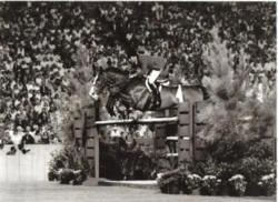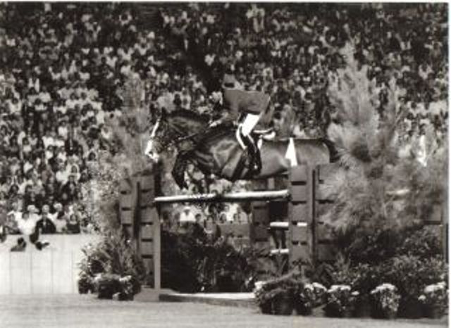 Horse Jumping during an American Invitational Tournament. Rider: Tim Grubb. Horse: Linky. Approx. date: 1984.