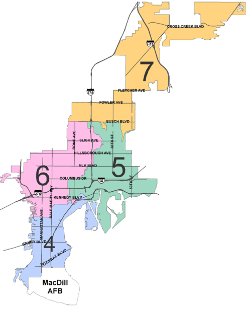 The district is bordered on the West by Old Tampa Bay, the Courtney Campbell Causeway, Rocky Point Golf Course, Tampa International Airport and the City Limit line, up to Hillsborough Avenue. The district then continues East following the City Limit Line along Hillsborough Avenue and Henry Avenue. The district then continues North following the City Limit Line along Armenia Avenue to Waters Avenue. The district then continues East along Waters Avenue to Huntley Avenue. The district then meanders North along Huntley Avenue, East along Wood Street, South along Mitchell Avenue, East along Fairbanks Street, South along Nebraska Avenue, East along the Hillsborough River, South across the River, Northeast along Park Circle, South along 18th Street, West along Sligh Avenue, South along 17th Street, East along Knollwood Street, South along Escort Avenue, East along Diana Street, South along 19th Street, West and South along Lambright Street N., East along Lambright Street S., South along 17th Street, West along North Street, South along 15th Street, West along Paris Street, South along 12th Street, West along Clifton Street, Southwest and North along Roberta Circle, West along Clifton Street, South along Nebraska Avenue, West along Ida Street, South along Taliaferro Avenue, West along Dr. Martin Luther King, Jr. Blvd., South along Florida Avenue, West along Virginia Avenue, South along Tampa Street, East along Kentucky Avenue, South along Florida, West along Indiana Avenue, South along Arlington Avenue, West along Ohio Avenue, North along Highland Avenue, West along Indiana Avenue, South along Dartmouth Avenue, West along Woodlawn Avenue, South along Ola Avenue, East along Plymouth Street, South along Highland Avenue, West along Adalee Street, South along Ola Avenue, West along Alfred Street, South along Massachusetts Avenue, West along West Street, South along Boulevard, West along Warren Avenue, South along Esther Street, West along Euclid Avenue, South along Munro Street, West along Columbus Drive, South along Armenia Avenue, East along Interstate 275, South along Howard Avenue, West along Gray Street, South along Armenia Avenue, East along North "A" street, South along Moody Avenue, East along Cleveland Street, South along Boulevard, West along Platt Street, South along Willow Avenue, West along Horatio Street, South along Oregon Avenue, West along De Leon Street, South along Dakota Avenue, West along Swann Avenue, North along Fremont Avenue, West along De Leon Street, North along Melville Avenue, West along Platt Street, South along Armenia Avenue, East along Horatio Street, South along Howard Avenue, West along De Leon Street, South along Armenia Avenue, Southwest along Parkland Blvd., West along Fountain Blvd., North along Audubon Avenue, West along Swann Avenue, Southwest along Henderson Blvd., South along Dale Mabry Highway, West along Palmira Avenue, North along Manhattan Avenue, then West along San Jose Street finishing the district boundary.