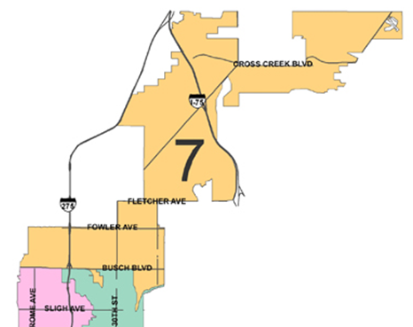A single member district, running North from Waters Avenue to County Line Road, including Forest Hills, Terrace Park, New Tampa, and University of South Florida.