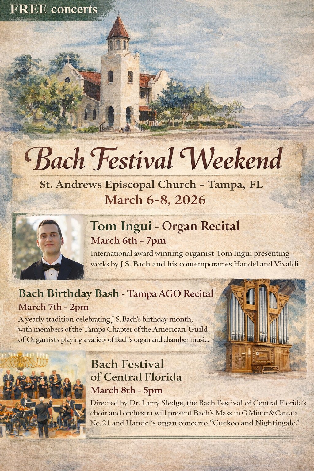 A yearly tradition celebrating J.S. Bach’s birthday month, with members of the Tampa Chapter of the American Guild of Organists playing a variety of Bach's organ and chamber music. Part of St. Andrew's Bach Festival Weekend. Free and open to the public.