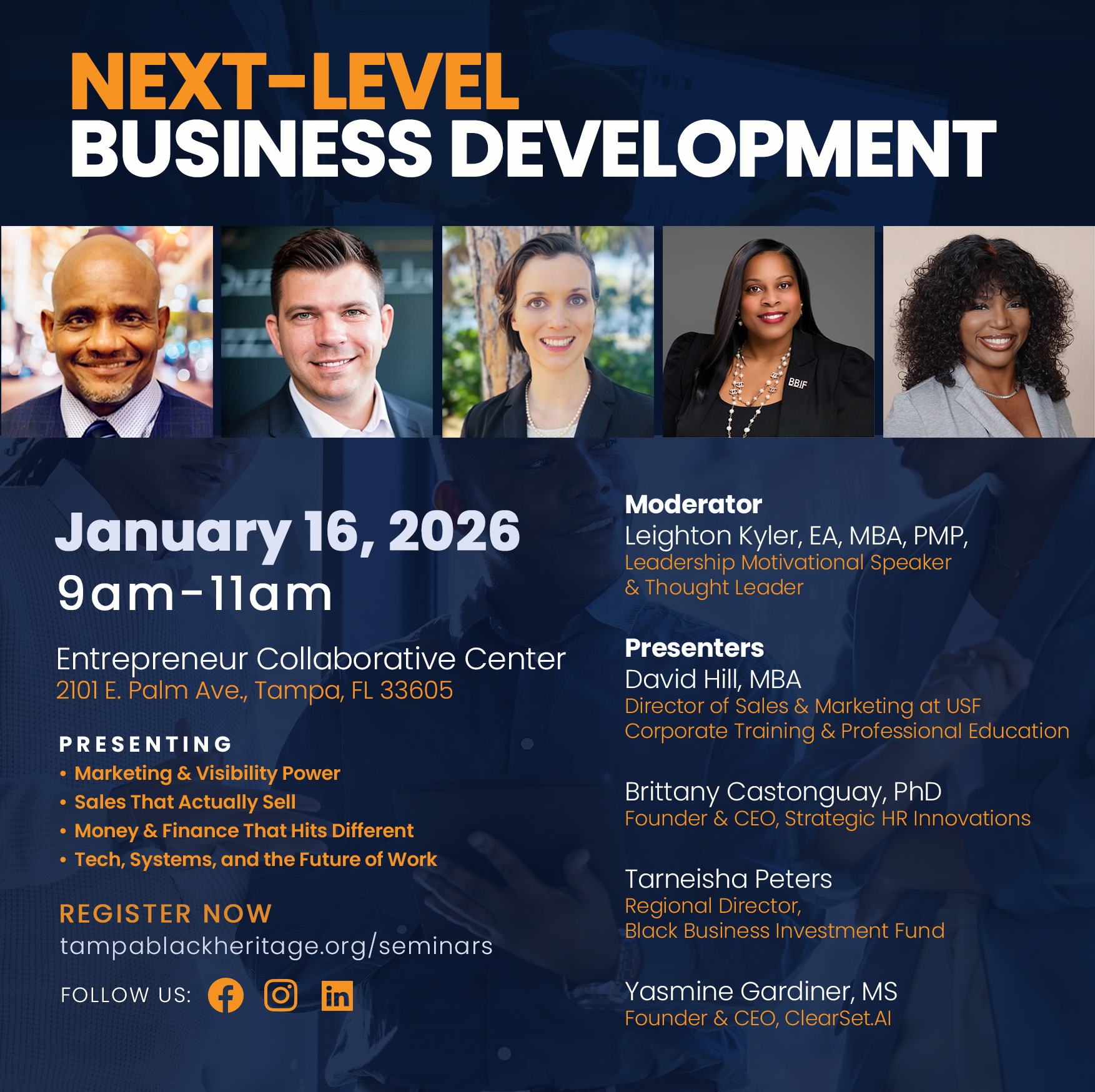 Jan 16th 9am - 11am. The Tampa Bay Black Heritage Festival Business Seminar Series returns with powerful conversations on Marketing & Visibility, Sales That Actually Sell, and Tech Systems & the Future of Work. Practical insights, real strategies, and tools designed to help businesses grow and adapt.