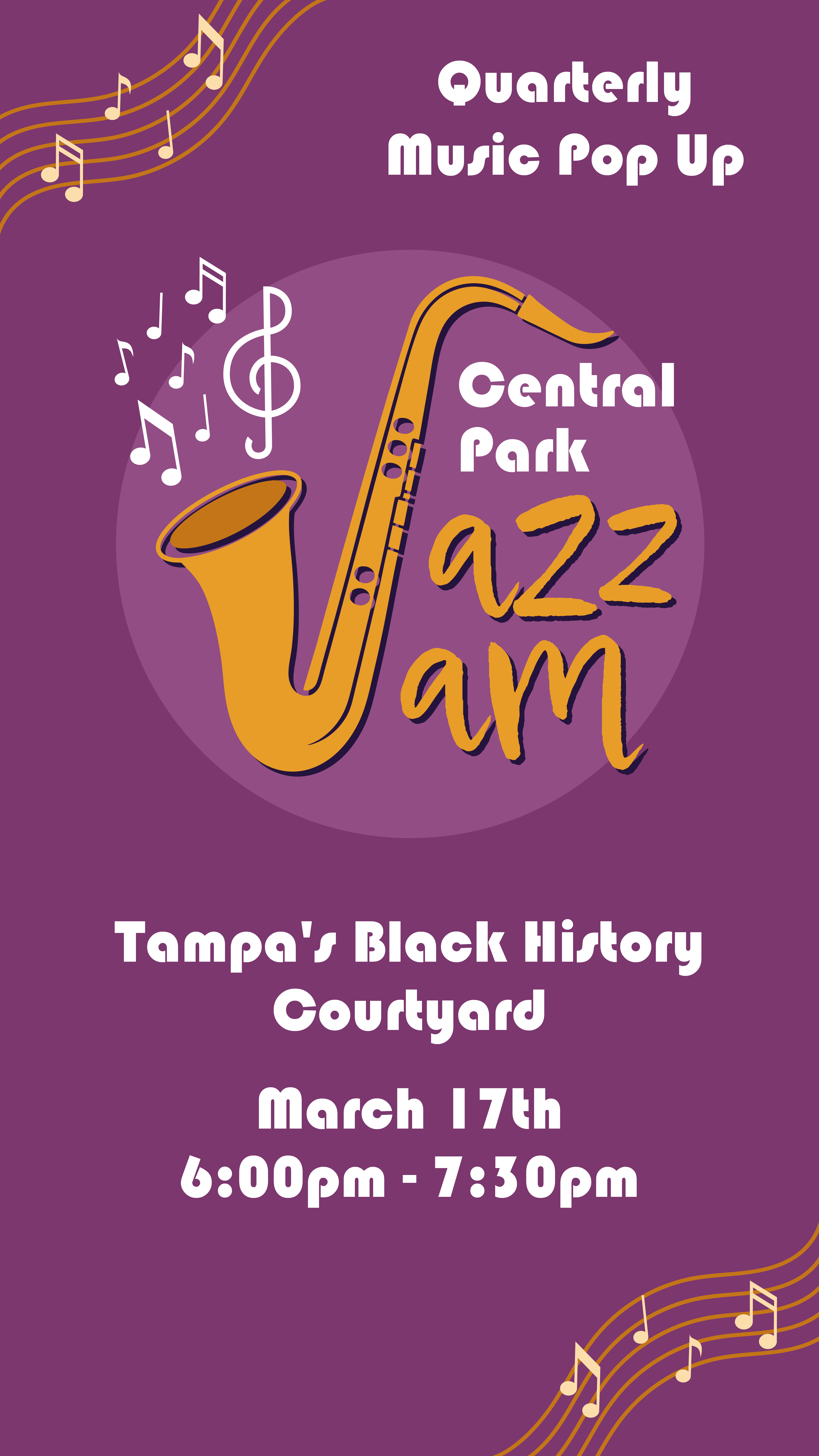 Let the good times roll at Central Park Jazz Jam! This FREE community event celebrates the musical history of Downtown Tampa’s Central Park neighborhood. Enjoy LIVE performances from local bands and musicians, along with family-friendly fun from the YMCA. Bring a chair (and your dancing shoes!) as we fill the courtyard of the Tampa Black History Museum with encore-worthy music and community vibes. So let’s get jazzy and swing it like you mean it… this jam is sure to end your evening on a high note!