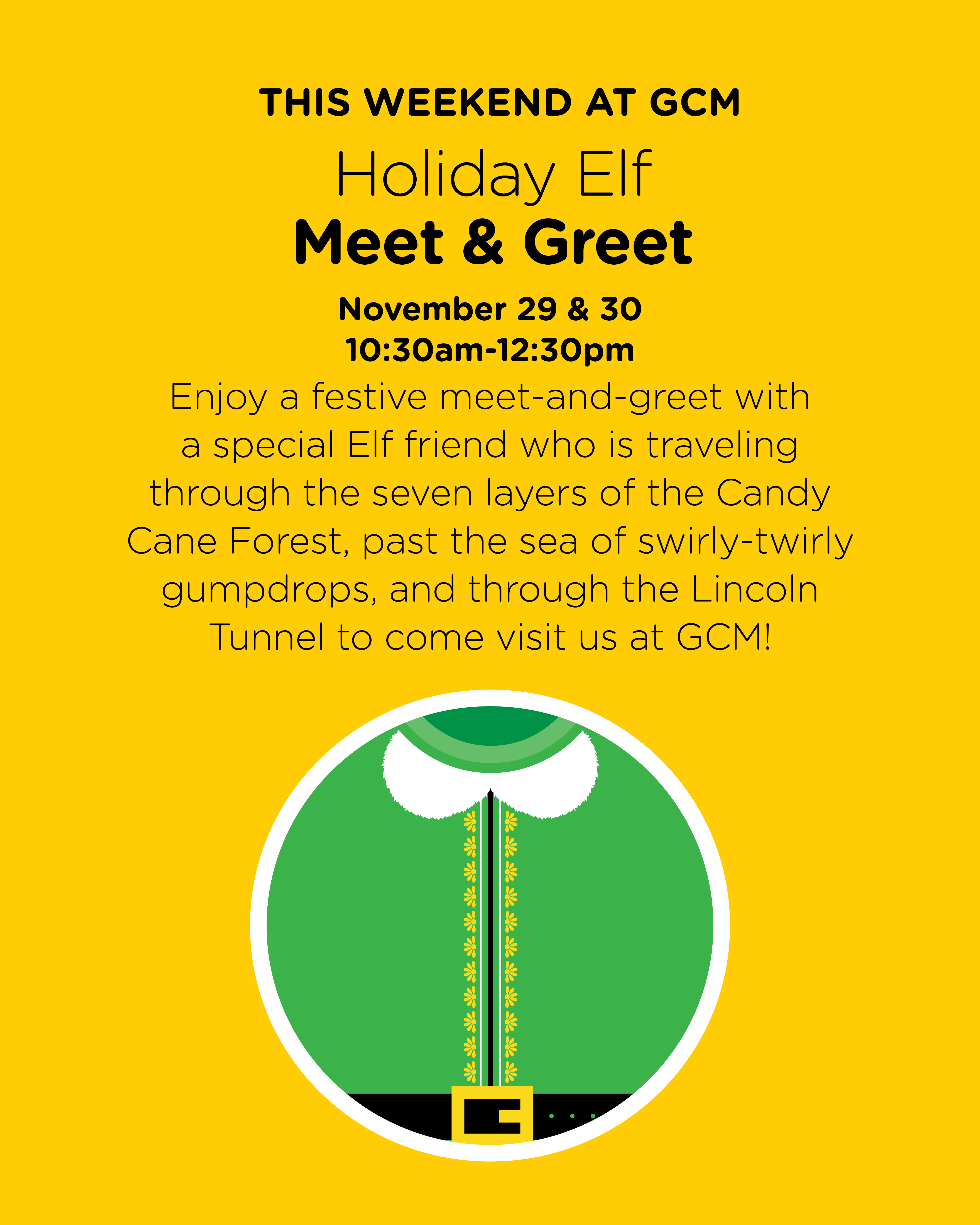 Enjoy a festive meet-and-greet with a special elf friend who is traveling through the seven levels of the candy cane forest, past the sea of twirly-swirly gumpdrops, and through the Lincoln Tunnel to come visit us at GCM!