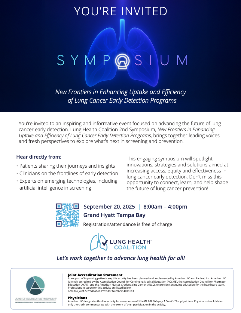 You’re invited to an inspiring and informative event focused on advancing the future of lung cancer early detection. Lung Health Coalition's 2nd Symposium, New Frontiers in Enhancing Uptake and Efficiency of Lung Cancer Early Detection Programs, brings together leading voices and fresh perspectives to explore what’s next in screening and prevention.