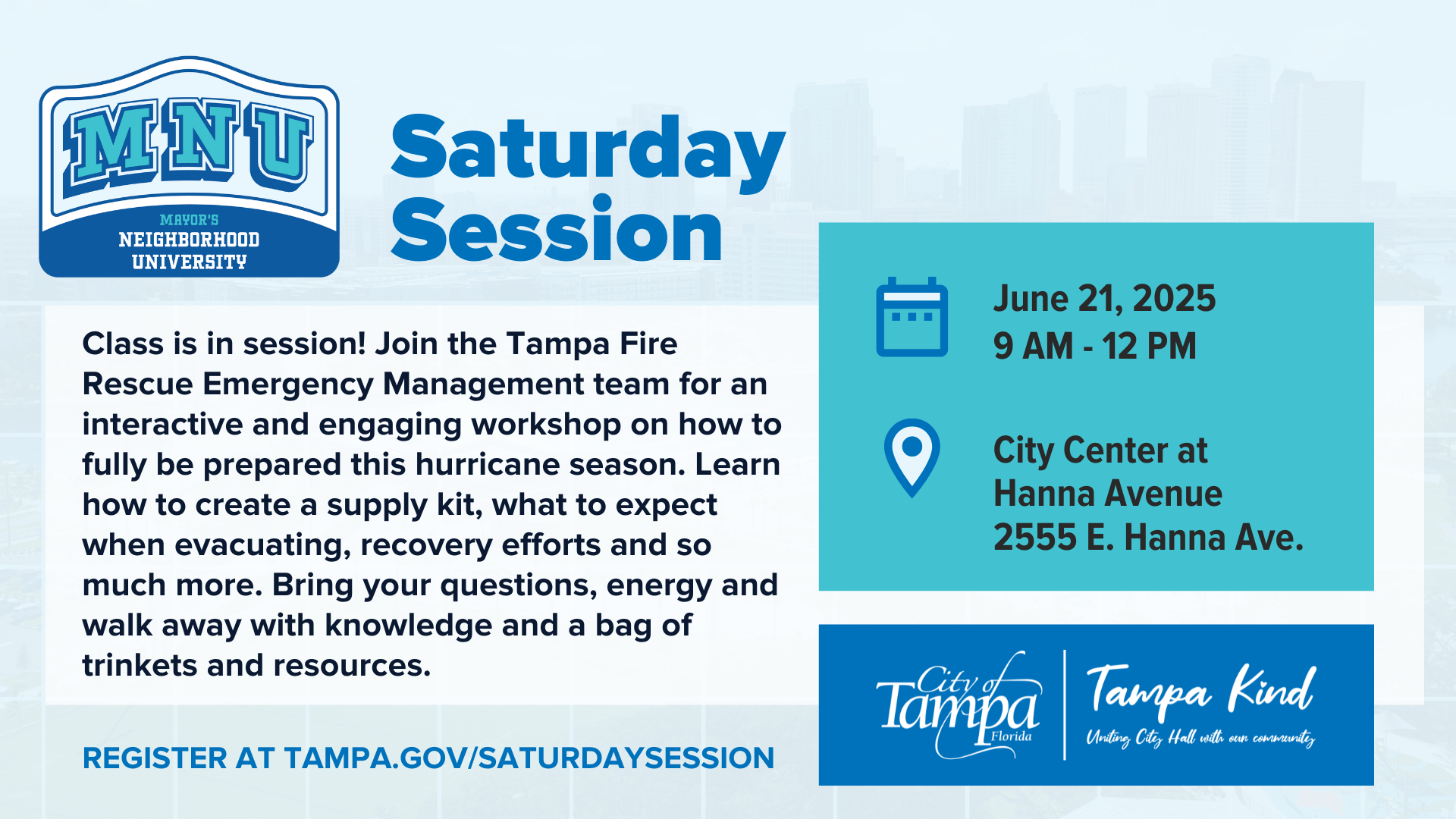 Class is in session! Join Tampa Fire Rescue Emergency Management for an engaging, hands-on hurricane preparedness workshop. Learn how to build a supply kit, plan for evacuation, understand recovery efforts, and more. Participants will receive emergency-ready meals, a debris cleanup bucket, and a bag filled with helpful resources.