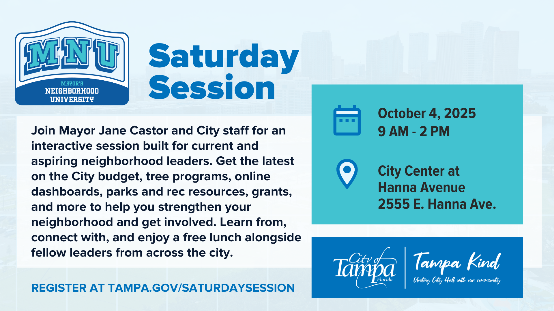 The Mayor’s Neighborhood University Saturday Session program is an initiative of the City of Tampa Community Engagement and Partnerships Department that empowers more residents to connect directly with City leaders, learn about vital resources, and become active participants in shaping Tampa’s future.