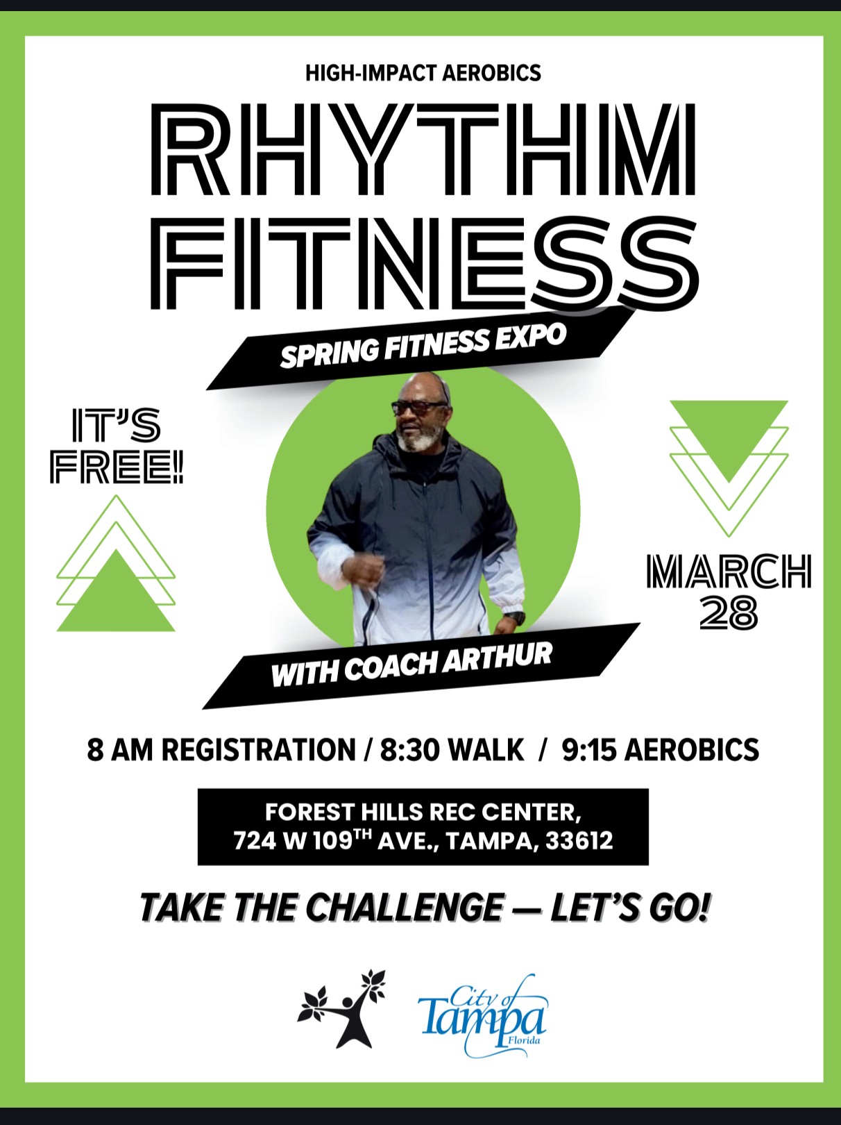 Rhythm Fitness is a great event of fitness, fun, and friends. Registration begins at 8 am, with a walk at 8:30. High-impact aerobics begin at 9:15. Coach Arthur will make sure it's a great time - what better way to get healthier?
