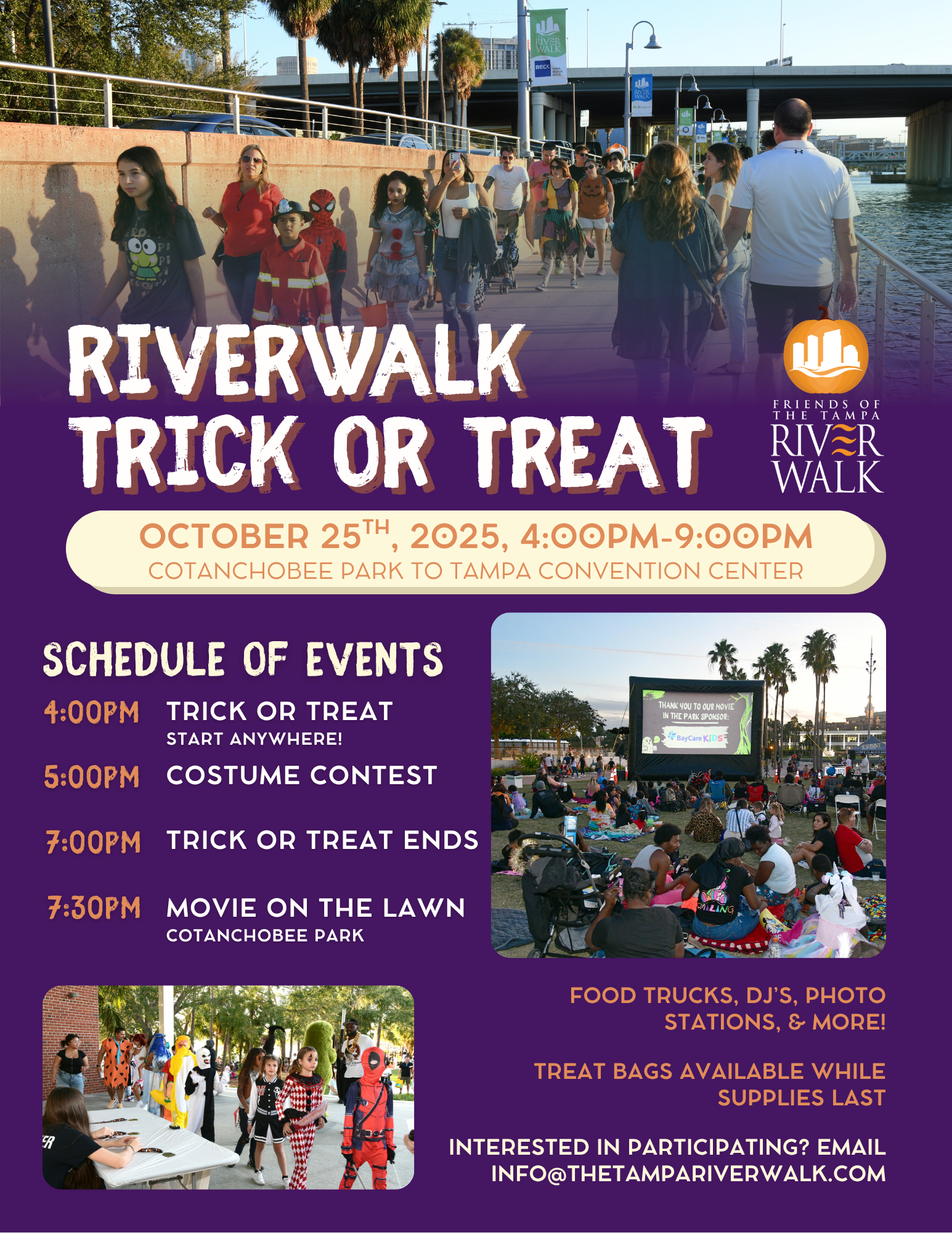 Join Friends of the Riverwalk for our 9th annual Riverwalk Trick or Treat! This FREE community event invites children in costume and their families to come and trick or treat along the Tampa Riverwalk from Cotanchobee Park to The Tampa Convention Center.
