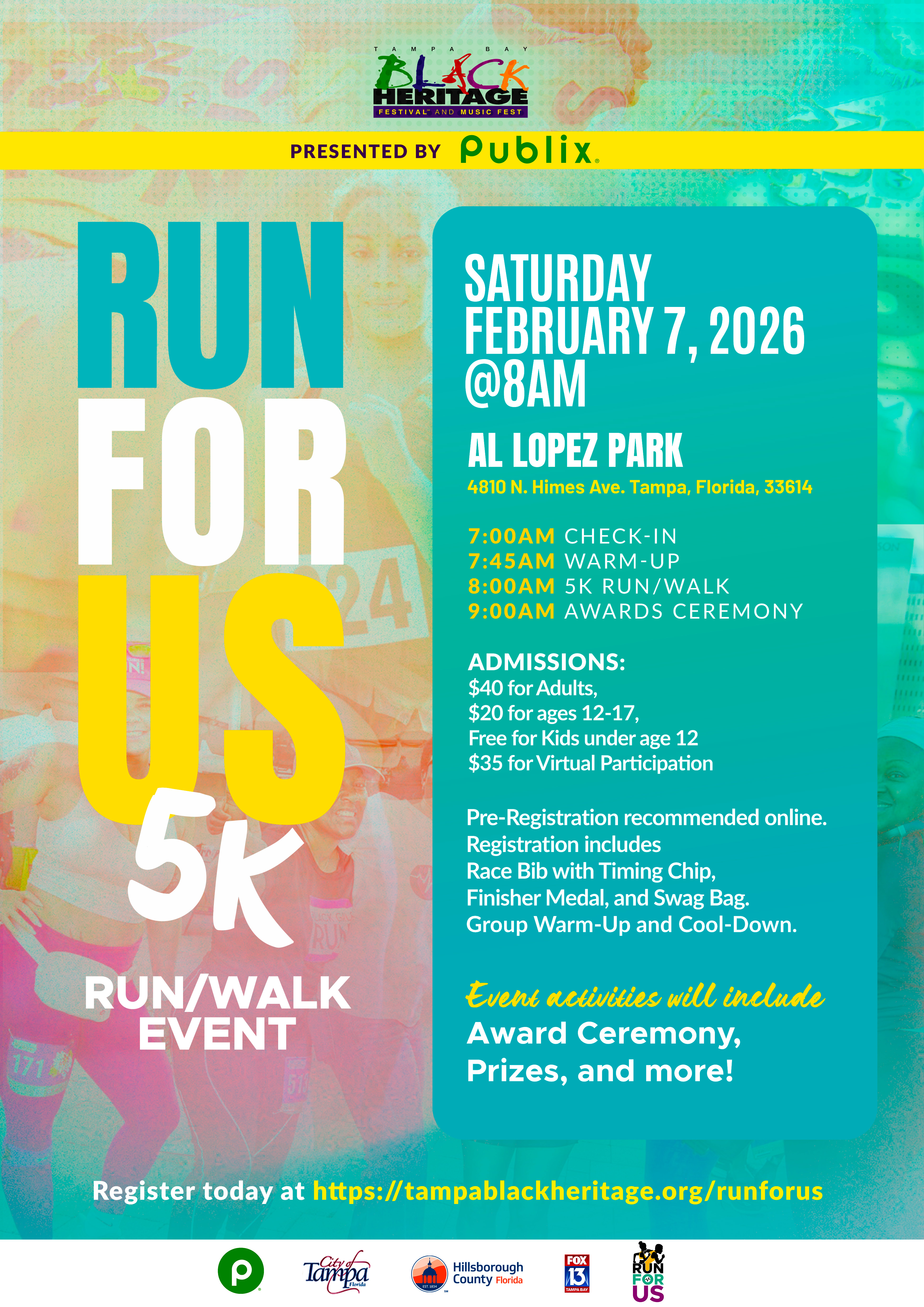 The Tampa Bay Black Heritage Festival Annual 5K Run/Walk for Health & Wellness presented by Publix. If you missed out this year register today with family and friends for Saturday, February 7, 2026 at Al Lopez Park.