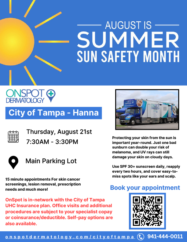 Skin Screening Event! Two event dates and locations are listed: August 21, Thursday at Hanna City Center, 2555 E. Hanna Ave., 7:30 AM - 3:30 PM, and September 10, Wednesday at Lykes Park (adjacent to TPD HQ), 7:30 AM - 3:30 PM. 15-minute appointments for skin screening, lesion removal, prescription needs, and MORE! Register Now.