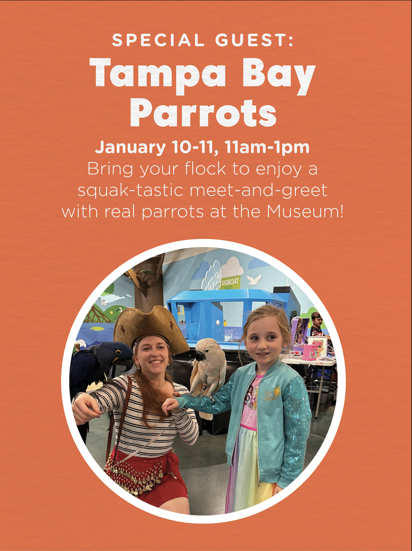 Ahoy, mateys! 🦜💛 Our friends from Tampa Bay Parrots are bringing their flock to GCM for some swashbuckling fun this weekend! Join us on January 10 & 11, from 11am–1pm, for a special meet-and-greet. It’s a wonderful chance for your little explorers to see these colorful birds up close and learn all about them.