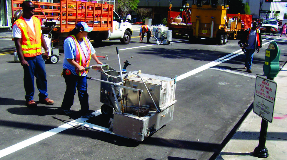 Each colored dot represents a specific type of work order. Click on a dot to view details, including the type of work and completion date. You can also filter results by work order type and City Council district using the menu on the left.