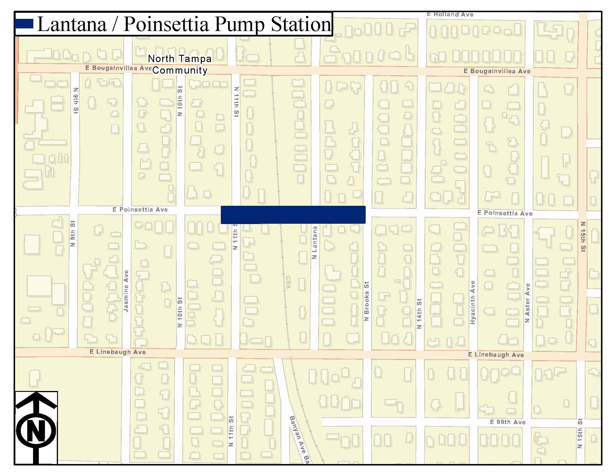 Currently a temporary pump is utilized to drain the low-lying area along E Poinsettia Avenue between N Brooks Street and N Lantana Avenue. The proposed project will replace the temporary pump with a permanent pumping station.