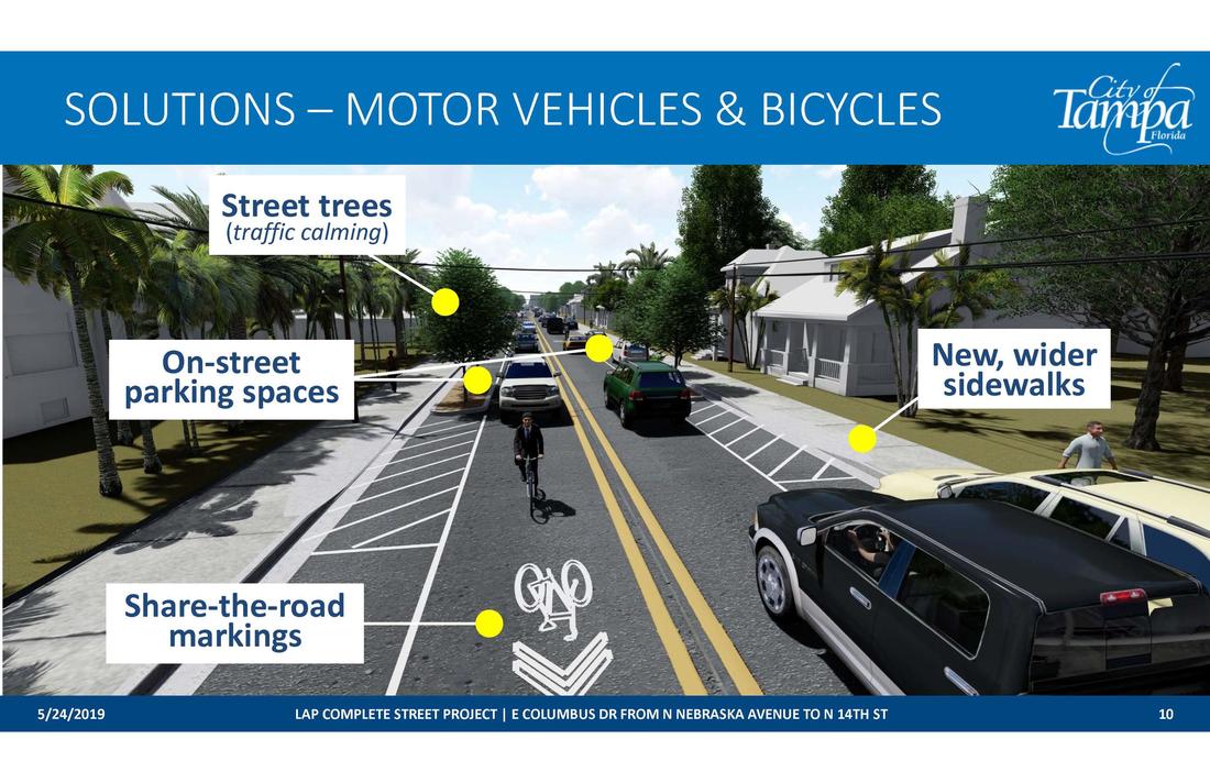 The 0.4-mile segment of Columbus Drive from Nebraska Avenue to 14th Street is a 2-lane (one travel lane in each direction) arterial roadway with a posted speed of 30 mph and has an average daily traffic volume of 10,210 vehicles per day. Reconfiguration of the roadway to 11-ft vehicle travel lanes with shared lane pavement markings for cyclists allows for improvements including: