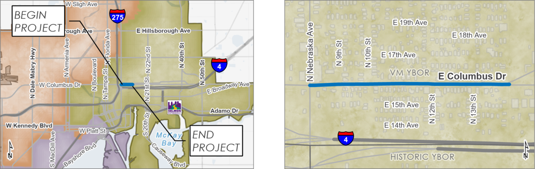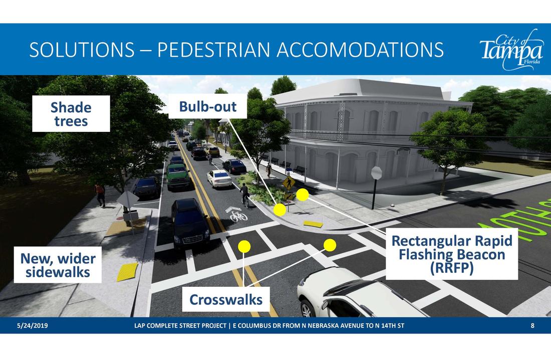 The Hillsborough County Metropolitan Planning Organization (MPO)/City of Tampa Walk-Bike Plan Phase I - Final Report identified the E Columbus Dr project as the fourth-highest priority walk-bike project for the City. The InVision Center City Plan also identified this segment of E Columbus Dr as a key corridor to provide safe, walkable, and bikeable neighborhood connectivity. The design of this project prioritizes pedestrian safety, enhances the transit stops along the corridor, and provides cyclists with options while maintaining vehicular capacity and on-street parking.