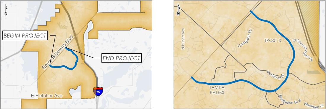 The City of Tampa Mobility Department is working to design the Tampa Palms Boulevard Complete Streets Project. Corridor-wide maintenance, operational, multi-modal, safety, and traffic calming are included in the scope of the planned improvements. Roadway improvements for the 4-mile loop incorporate upgrades to pedestrian facilities, traffic calming elements, reduced posted speeds, as well as pavement resurfacing. Details are as follows: