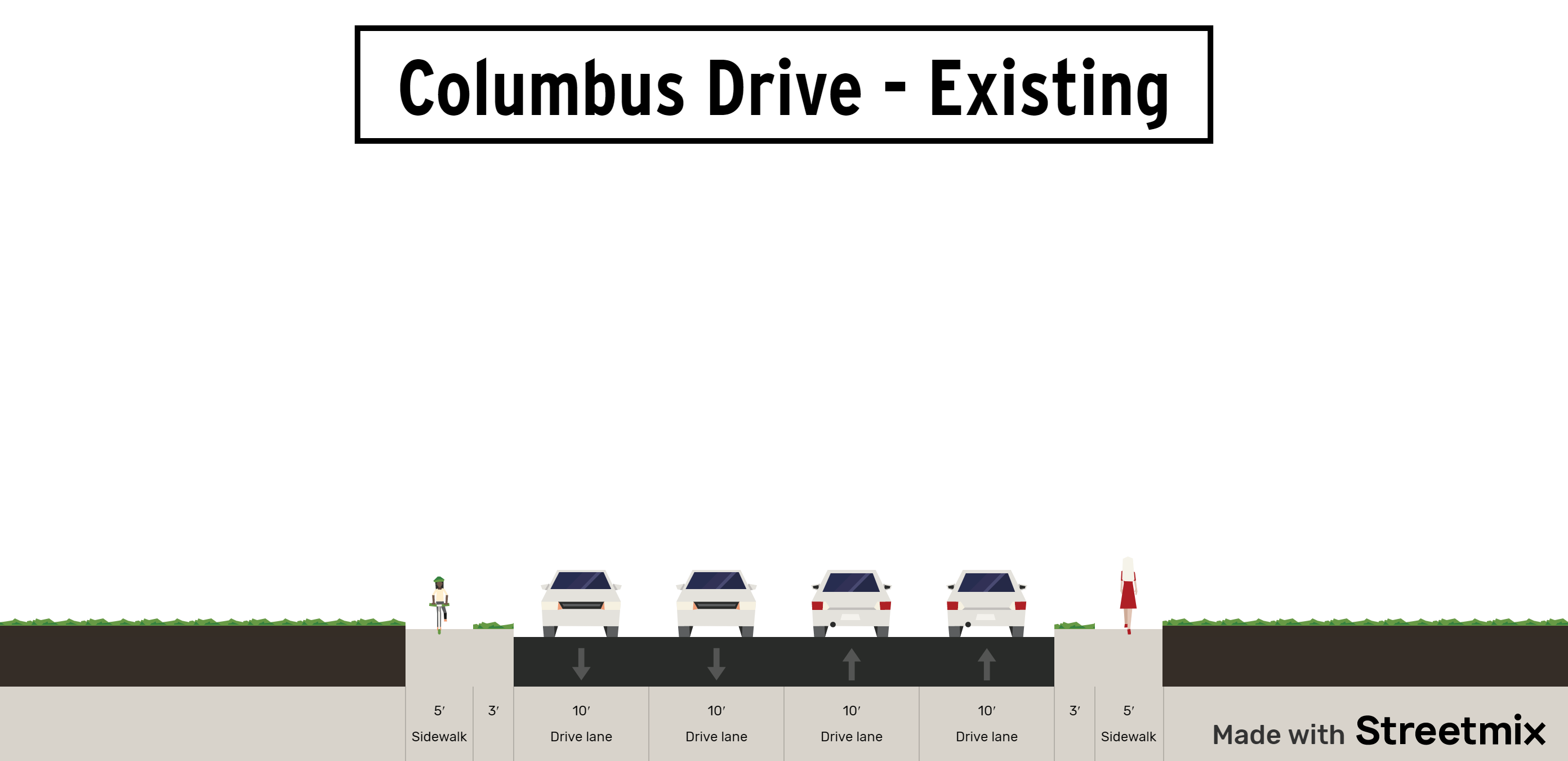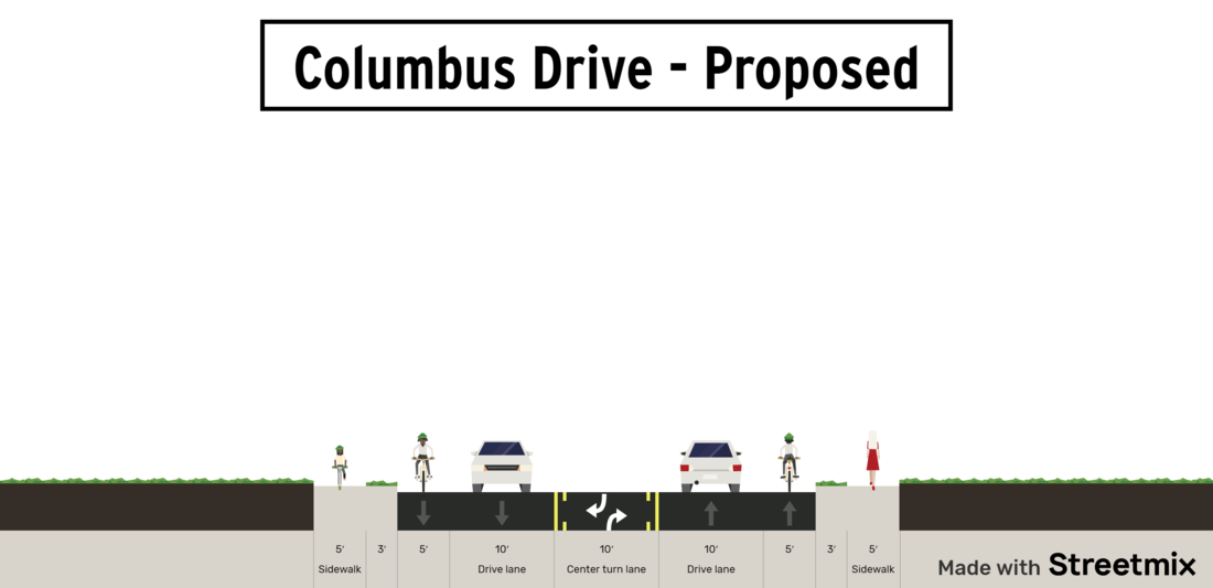At this time, the following cross sections and concept plans are under consideration for the segment of Columbus Drive from east of Howard Avenue to west of North Boulevard: