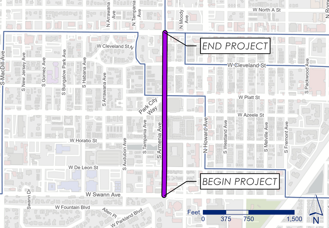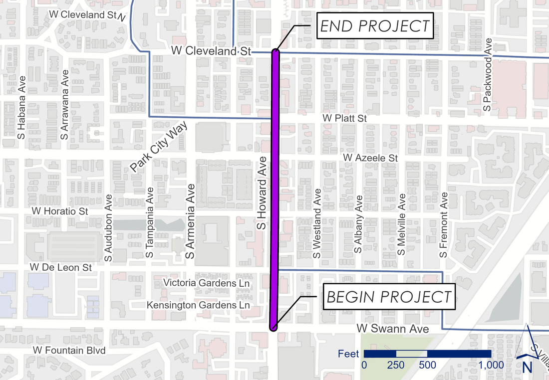 Howard Ave and Armenia Ave are being resurfaced from Swann Ave to Kennedy Blvd. Additional parallel parking and narrower lanes will be installed on Howard Ave to support businesses and calm traffic, increasing safety on this busy pedestrian corridor. Separated bike lanes are being installed on Armenia to connect to the bike lanes the county will install north of Kennedy Blvd. This project will be finished in the first half of 2025.