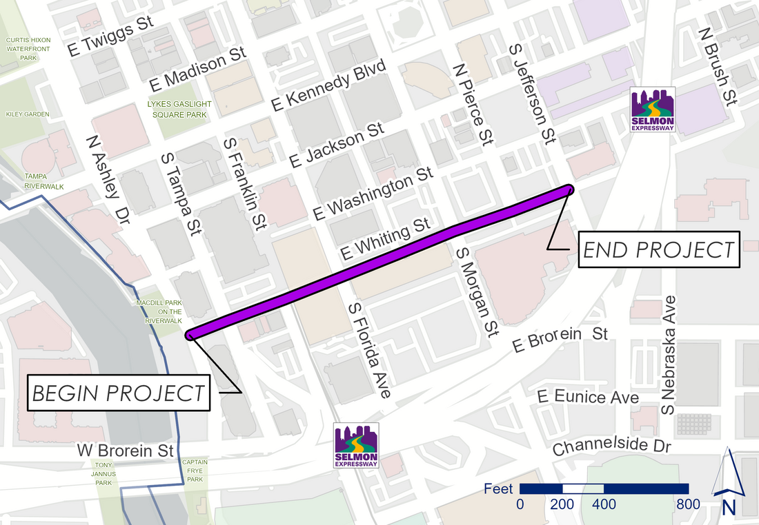 This project will utilize excess space on Whiting St to construct separated bike lanes from Ashley Dr to Jefferson St on the north side of the road. The roadway will be resurfaced, and new signs and pavement markings installed. Parking and necessary travel lanes will be maintained. This project will make Whiting St safer and more livable while preserving important capacity on the roadway during events at Amalie Arena. This project will begin construction in the second or third quarter of 2026.