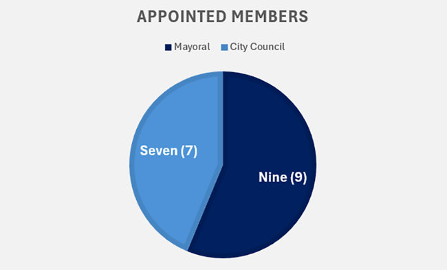 - Sixteen (16) Members: Nine (9) Mayoral appointments; Seven (7) City Council appointments.