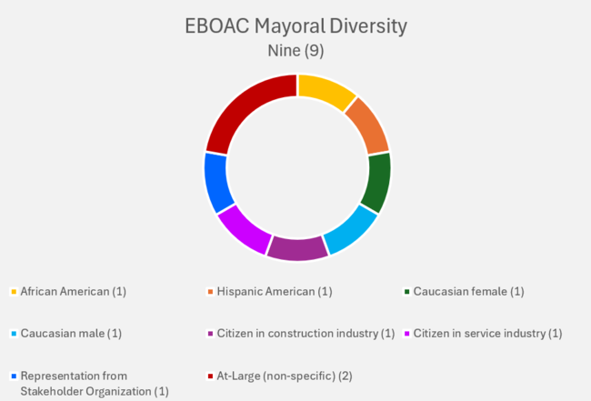 - Appointments should represent a cross-section of contractors, service providers, and stakeholder organizations, as well as ethnicity and gender.