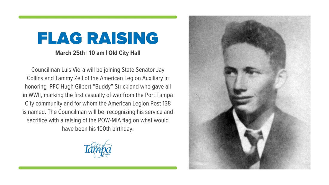 Councilman Luis Viera, alongside State Senator Jay Collins and Tammy Zell of the American Legion Auxiliary, will lead a flag raising ceremony to honor the memory and sacrifice of PFC Hugh Gilbert “Buddy” Strickland, the first casualty of war from the Port Tampa City community.