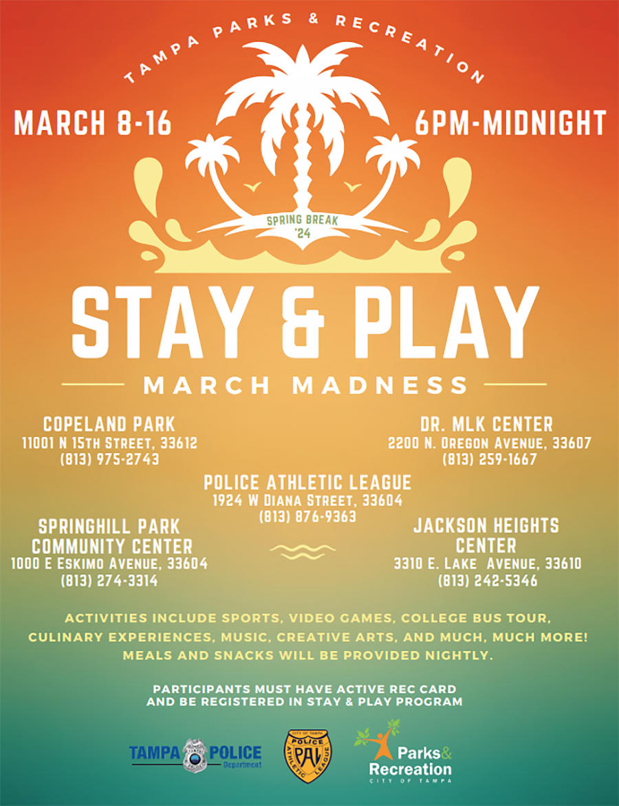 Beginning Friday evening, March 8, the first day of Spring Break, Stay & Play hours will be extended from 10 pm to midnight at four city park locations, and an additional fifth Stay & Play location, also open until midnight, will be available at the Tampa Police Athletic League (PAL), located at 1924 W Diana St. A Tampa Police officer will be on-site at all five Stay & Play locations each night.