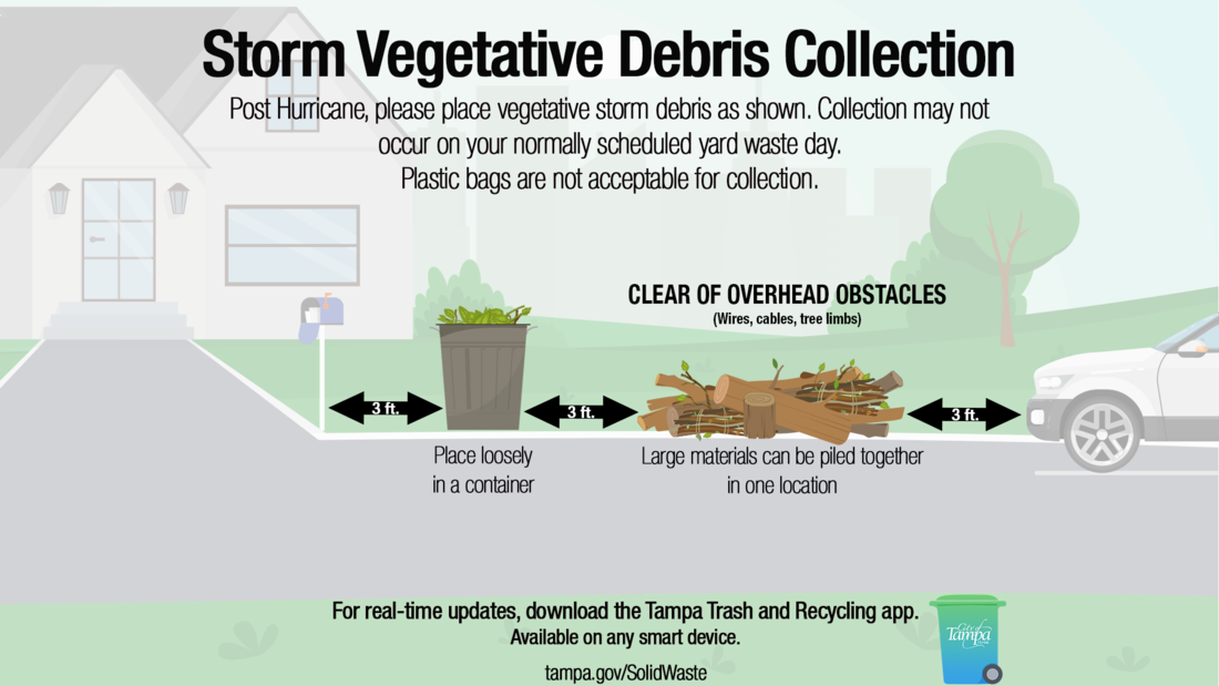 The City of Tampa Solid Waste Department is concluding the collection of vegetative storm debris as of August 23, 2024. Residents are requested to place their hurricane vegetative debris curbside as soon as possible. Vegetative debris will be collected on the customer's designated yard waste collection day.