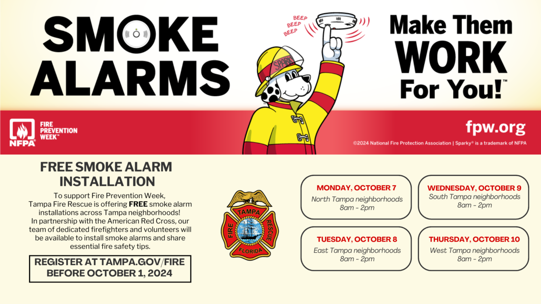 During the week, Tampa Fire Rescue, in partnership with the American Red Cross of Central Florida, will offer free smoke alarm installations across Tampa neighborhoods. Residents can sign up at Tampa.gov/fire by clicking on the Fire Prevention Week link.