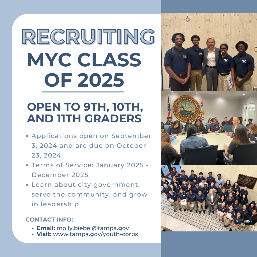 The Mayor’s Youth Corps is comprised of students in grades 9, 10, and 11 who live in and/or attend a public or private high school within Tampa city limits. Applications are now being accepted for one-year terms. Applications are available on the City of Tampa Mayor’s Youth Corps webpage and will be accepted until October 23, 2024, at 5:00 p.m.