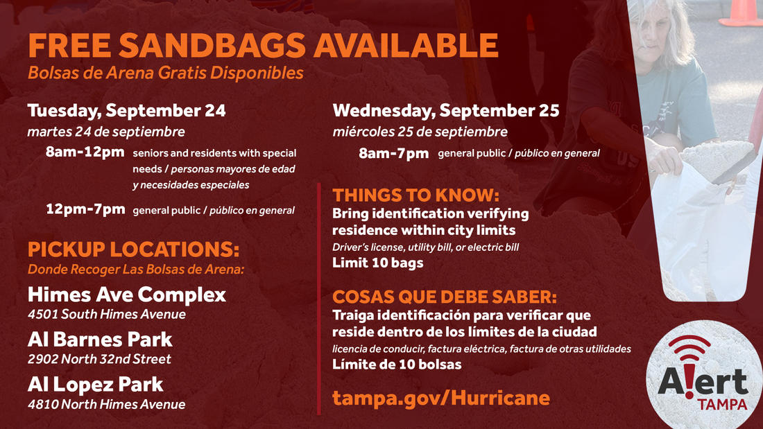 In advance of what is expected to become Hurricane Helene impacting the Gulf Coast, the City of Tampa is opening sandbag distribution sites begin tomorrow, Tuesday, September 24, at 8 a.m. Sandbag operations will commence at three locations for senior residents and those needing extra assistance. Starting at noon on Tuesday, sandbags will be available to all residents until 7 p.m. Operations will resume for all residents from 8 a.m. to 7 p.m. on Wednesday, September 25. Please note that schedules may be adjusted depending on weather conditions. Additional storm preparations are occurring citywide. Stormwater crews are actively clearing drainage systems to ensure maximum capacity, work that occurs year-round but is intensified ahead of storms. Solid Waste will work in the coming days to clear portions of the transfer station and Waste-to-Energy Plant to make room for potential post-storm debris, and in addition to working at sandbag locations, Parks & Recreation and other various city staff are preparing to potentially staff hurricane shelters. Any media outlets requesting storm-related interviews are asked to email media@tampagov.net GET PREPARED: Stay Updated