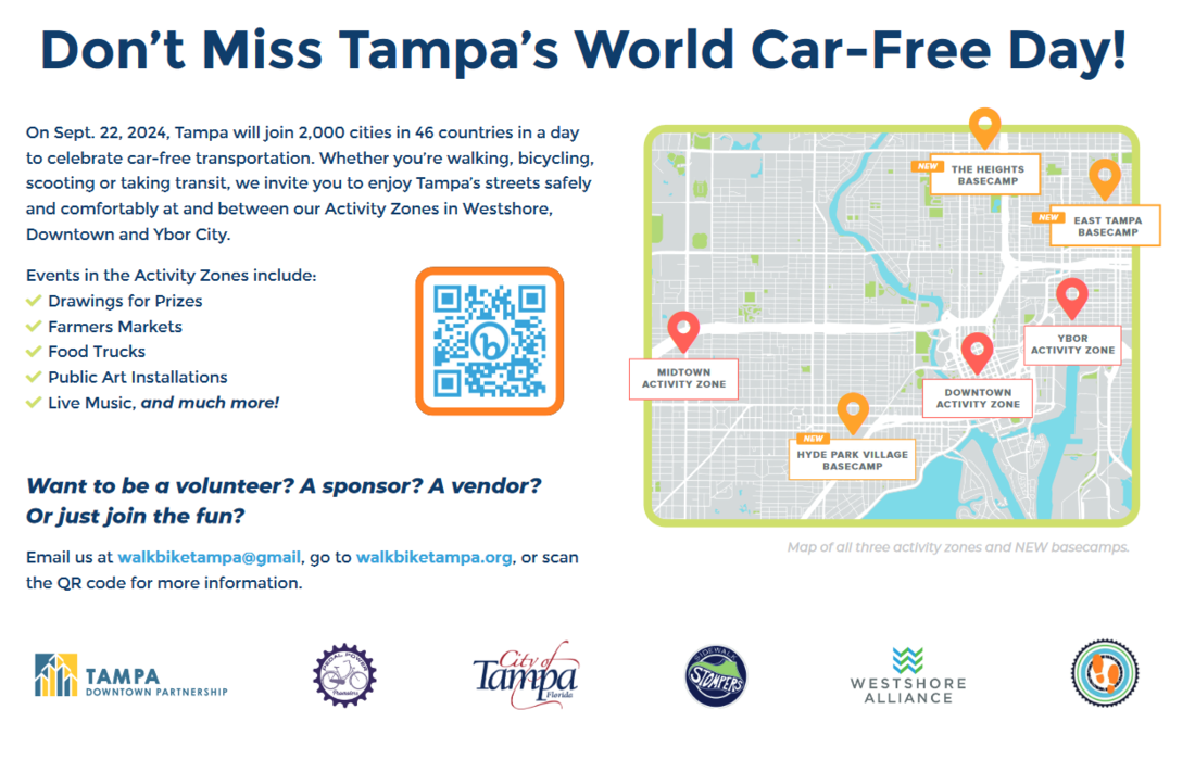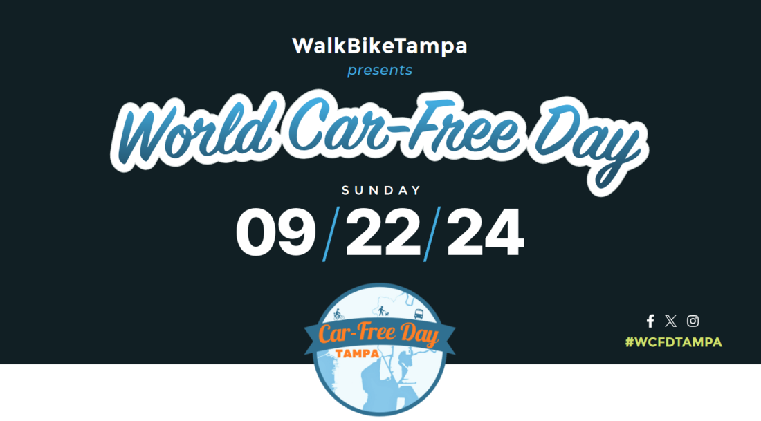 World Car-Free Day is celebrated world-wide on September 22 to promote investment in active transportation such as transit, bicycle and walking infrastructure, and to encourage development of communities where jobs, shopping and services are within walking distance. Tampa marked World Car-Free Day last year for the first time.