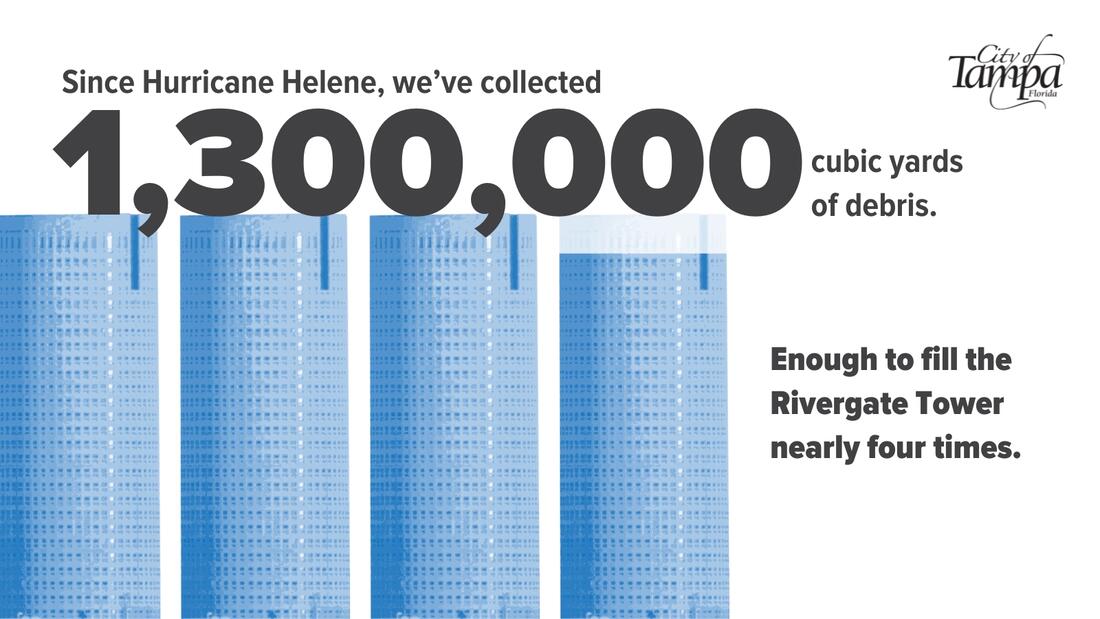 The volume of debris removed thus far is staggering, capable of filling Tampa’s iconic Rivergate Tower nearly four times!