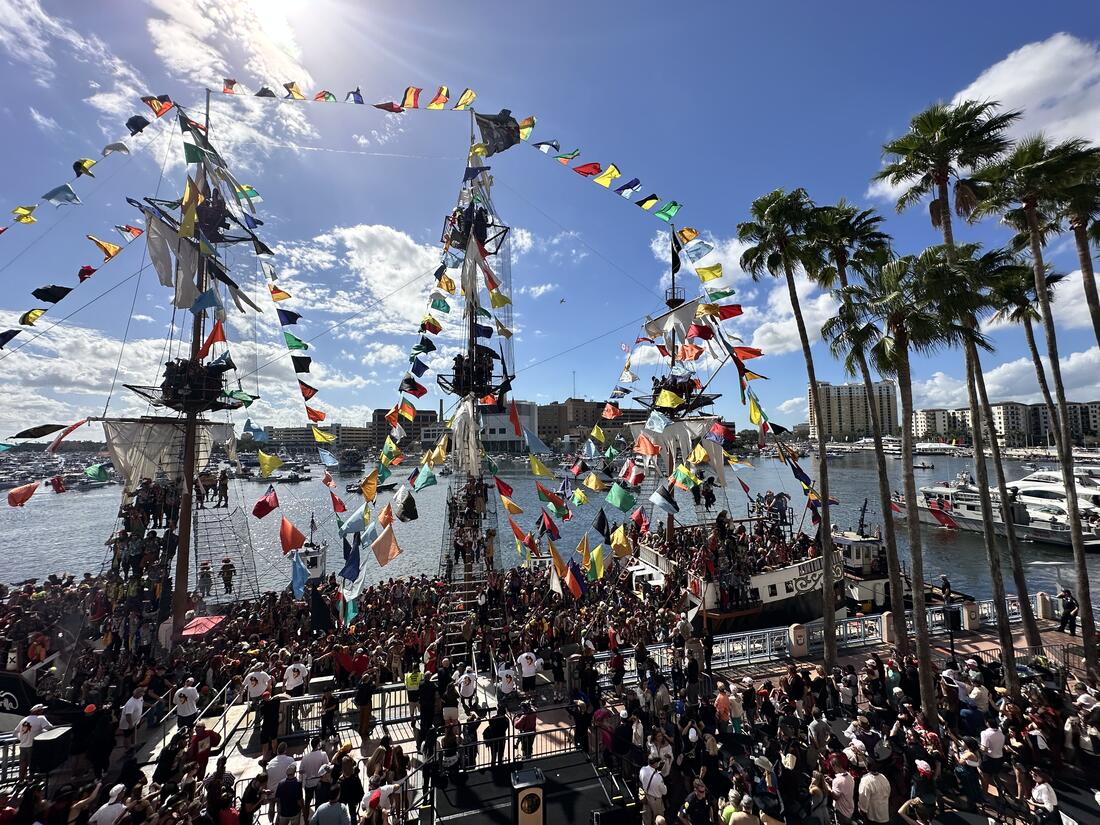 It’s Gasparilla month! Much of the iconic pirate invasion centers around the Tampa Convention Center, with the brunch experience happening at the center in the outdoor event space along the Tampa Riverwalk. The Jose Gasparilla ship docks directly outside the Tampa Convention Center, in its beautiful marina.