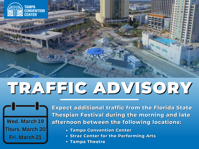Drivers should expect increased traffic from this event Wednesday, March 19 through Friday, March 21, particularly during the morning and late afternoon hours. Attendees will be walking and taking buses between the Tampa Convention Center, Straz Center for the Performing Arts, and Tampa Theatre.