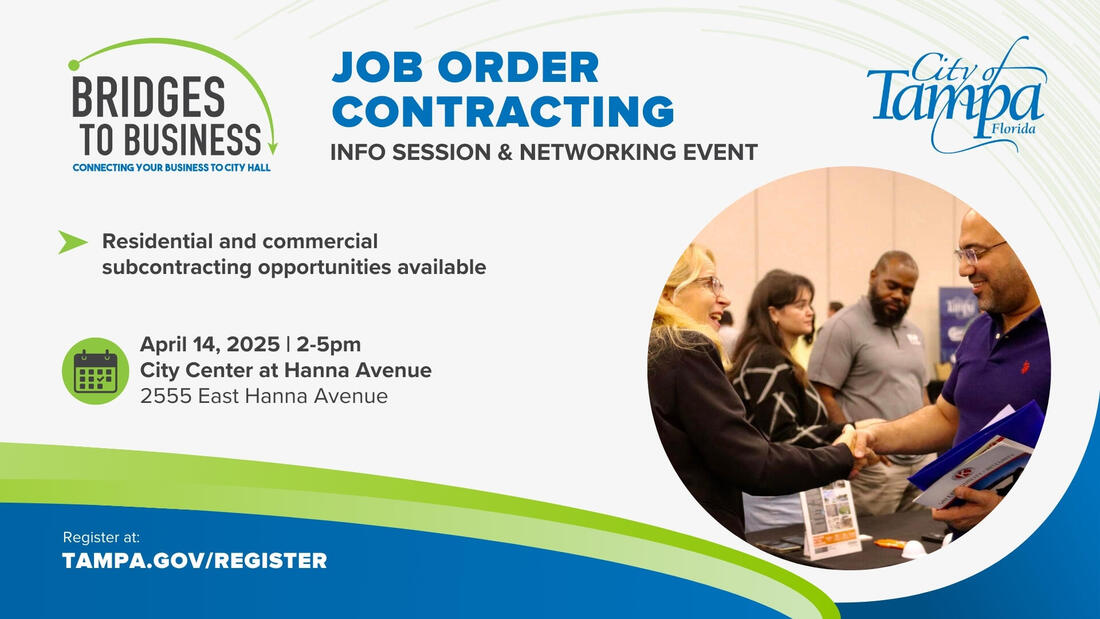 The City of Tampa is hosting a free event to connect local construction firms with upcoming subcontracting opportunities through its Job Order Contracting (JOC) program. The Bridges to Business JOC Info Session and Networking event takes place on Monday, April 14, from 2 p.m.to 5 p.m. at the Hanna Avenue City Center, 2555 East Hanna Avenue.