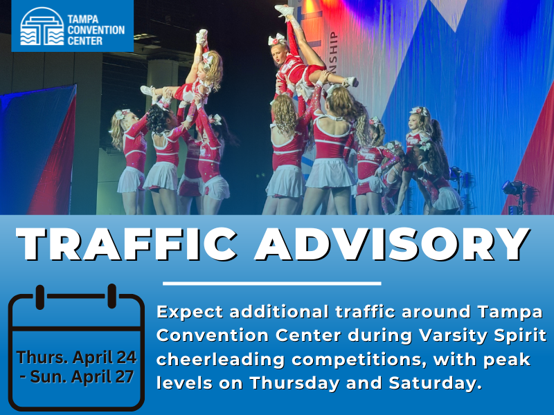 Drivers should expect extra vehicle and pedestrian traffic around the Tampa Convention Center on these dates, including along Franklin Street outside the venue. Traffic demand will peak on Thursday, April 24 and Saturday, April 26.