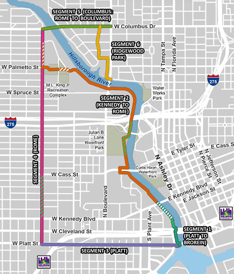 This segment consists of approximately 1.1 miles of complete street improvements including resurfacing the existing pavement along Platt Street from South Rome Avenue east to Bayshore Boulevard. This segment will provide a dedicated, low-stress connection from Rome Avenue through Hyde Park to the riverfront.