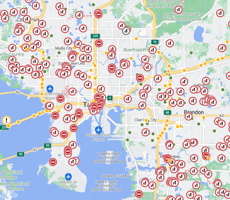 The platform's real-time map can be viewed at tampa.gov/road-closures. It features icons that note the type of work, traffic impacts, and timelines which are extremely helpful during trip planning.