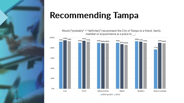 The survey found 93 percent of Tampa residents would recommend Tampa to a friend of family member as a place to live. Ninety two percent would recommend it as a place to work, 89 percent as a place to raise children, 86 percent as a place to retire, 90 percent as a place to vacation, and 89 percent to open a business.