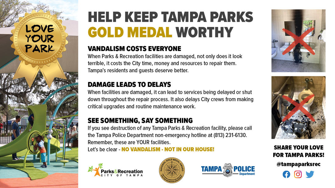 The “Love Your Park” campaign focuses on showing pride in our parks and deterring vandalism by activating community partners and encouraging neighbors to be our eyes and ears. Printed materials will be available inside various city facilities and recreation centers explaining the best ways to prevent and report vandalism. The City of Tampa’s Community Engagement & Partnerships Team will also help raise awareness about the issue with neighborhood associations across the city.