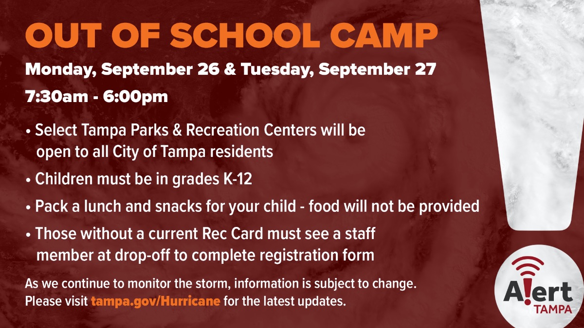 Out of School Camp sites will remain open through Tuesday, from 7:30 a.m. to 6:00 p.m. for students in Kindergarten through Grade 12. Families must live in the City of Tampa limits to be eligible and children must bring a packed lunch and/or snacks. All other Tampa Parks & Recreation programs and special events are cancelled until further notice. Please see below for the updated list of Out of School Camp sites and note the locations listed in red will be closed Tuesday because they are in Evacuation Zones A and B. A new location, the Dr. Martin Luther King Jr. Recreational Complex, has been added.