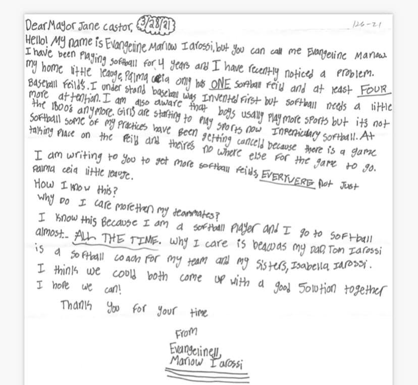 Thanks to a letter that landed on Mayor Castor’s desk from 9-year-old Evangeline Larossi, Tampa Parks & Recreation became aware of the growing need for more softball fields throughout the town. As she stated in her letter, “It’s not the 1800s anymore. Girls are starting to play sports now.”