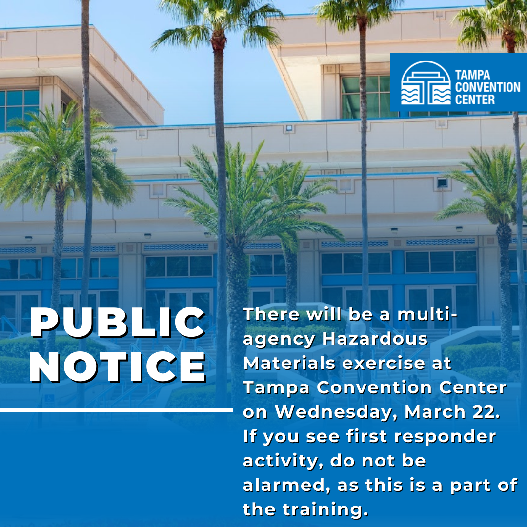 There will be a multi-agency Hazardous Materials Exercise at the Tampa Convention Center on Wednesday, March 22, 2023. If you see first responder activity, please do not be alarmed, as this is a part of the planned training.