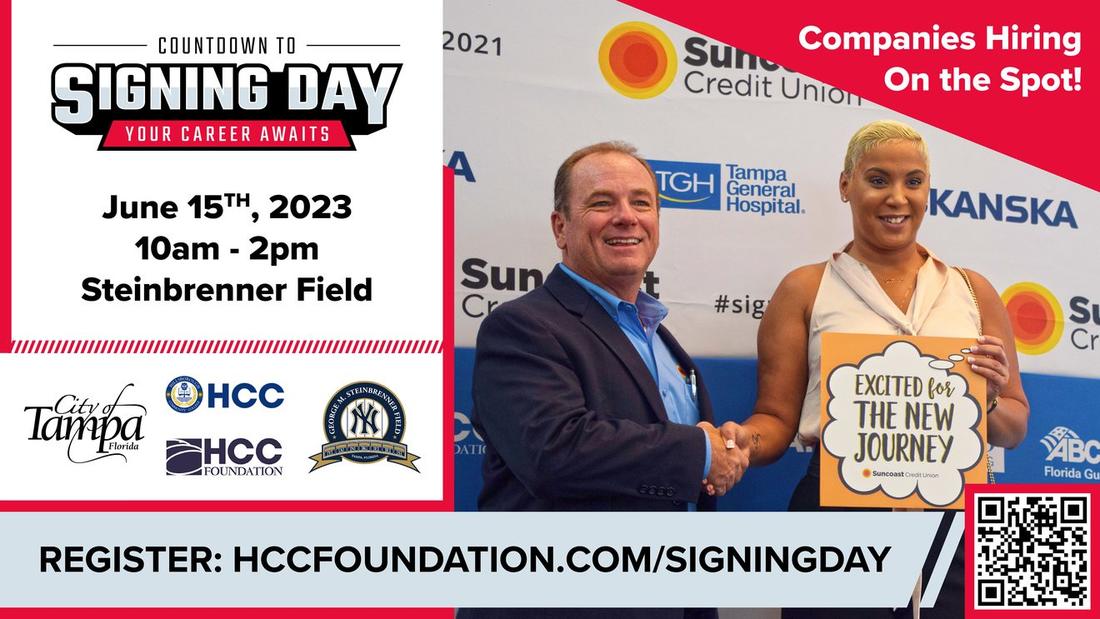 The City of Tampa is proud to team up with the HCC Foundation and other community partners for the 3rd annual Signing Day event. This interactive job fair and career pathways event will take place on Thursday, June 15, 2023, from 10:00 a.m. to 2:00 p.m. at Steinbrenner Field, located at 1 Steinbrenner Drive in Tampa.