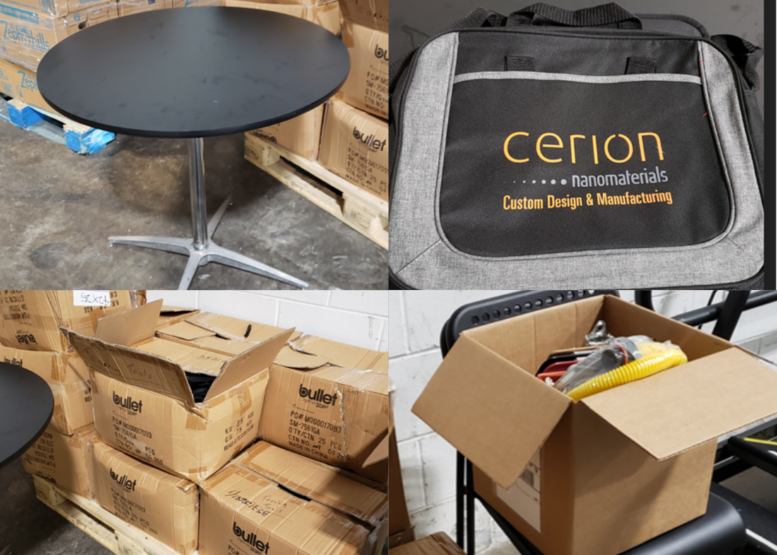 These items include tables. chairs, bags, and office supplies like pens, paper, and notebooks.