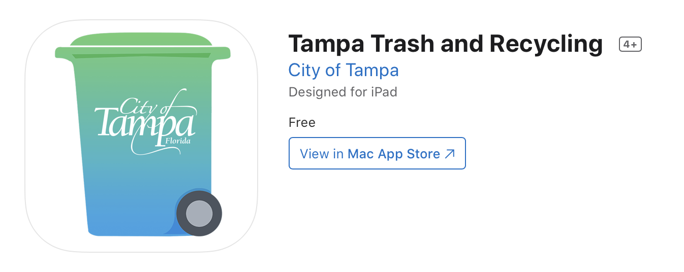 Residents can download the mobile app, Tampa Trash and Recycling, for Apple or Android smartphones. The app can be also be found on our website tampa.gov/Recycle for convenient calendar and waste items search.